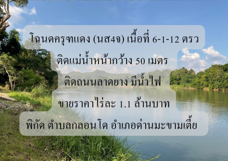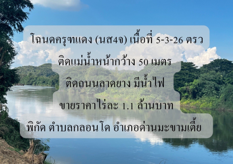 ที่ดินแปลงสวยริมแม่น้ำที่ดินแปลงสวยๆ ริมน้ำเป็นอีกหนึ่งความใฝ่ฝันของผู้ที่หลงไหลกับวิถีชิวิตริมสายน้ำ บ้างมีความฝันว่าจะปลูกบ้านตากอากาศหลังเล็กๆ ปลีกตัวเองจากความวุ่นวายของสังคมเมือง บ้างก็อยากมีสวนผลไม้ที่ร่มรื่นไว้เป็นความภาคภูมิใจและบางคนอาจคิดไปใหญ่กว่านั้น เพราะอยากหาทำเลดีๆ สร้างรีสอร์ทหรือโรงแรมไว้รับนักท่องเที่ยว หรือ บ้างก็อยากซื้อที่ดินเก็บไว้สำหรับการทำบ้านพักผู้สูงอายุ หรือ สถานื้นฟูสุขภาพเป็นต้นไม่ว่าจะด้วยวัตถุประสงค์ใดๆ ที่ดินริมแม่น้ำนั้นก็ยังเป็นที่ดินที่มีความต้องการหาซื้ออยู่เสมอ และ เราก็ได้รวบรวมที่ดินริมน้ำในจังหวัดต่างๆ มาให้ท่านได้เลือกเป็นเจ้าของ ทั้งแปลงเล็กและแปลงใหญ่จากทั่วไทย ที่สำคัญทุกแปลงมีเอกสารสิทธิ์ที่ถูกต้องจากทางราชการทุกแปลงและเรายังมีบทความดีๆ ของเทคนิคการเลือกซื้อที่ดินอย่างไรที่จะไม่ให้เสื่อมมูลค่าลงมาเล่าสูกันฟังอีกด้วย……ดูที่นี่ ที่ดินริมน้ำจังหวัดกาญจนบุรี อำเภอด่านมะขามเตี้ย ที่ดินริมน้ำอำเภอไทรโยค ที่ดินริมน้ำอำเภอทองผาภูมิ ที่ดินริมน้ำ อ.เมือง กาญจนบุรี ที่ดินชายทะเล อ.กุยบุรี ประจวบคีรีขันธ์ ที่ดินสวยใกล้ทะเลห่างชายหาดเพียง 150 เมตร ติดถนนตัดใหม่ 4 เลน ใกล้สถานีรถไฟรางคู่ และ ห่างตลาดเพียง 5 นาทีใกล้แหล่งท่องเที่ยวอุทยานแห่งชาติเขาสามร้อยยอด และปากน้ำปราณบุรี แหล่งอาหารทะเลสดๆแปลงละ 2 ไร่ จำนวนจำกัดเพียง 4 แปลงราคาเพียงไร่ละ 4.6 ล้านบาทเท่านั้น ราคาดีที่สุดในย่านนี้เหมาะสำหรับรีสอร์ท พูลวิลล่า และ สถานพักฟื้นสำหรับท่านที่สนใจยกแปลงเรามีข้อเสนอพิเศษให้คุณ Previous slide Next slide ที่ดินใกล้ชายทะเล อ.กุยบุรีที่ดินแปลงสวยเนื้อที่ 9 ไร่ ปัจจุบันเป็นสวนมะพร้าว ตัวที่ดินเป็นเอกสารโฉนด อยู่ห่างจากชายหาดเพียง 150 เมตรใช้เวลาเดินเพียง 2-3 นาทีเท่านั้น จากตัวที่ดินสามารถมองเห็นทะเลและรับลมเย็นสบาย ปัจจุบันในกุยบุรีนี้กำลังได้รับการพัฒนาอย่างรวดเร็ว สถานีรถไฟทางคู่ที่พร้อมเปิดให้บริการรถไฟวิ่งจริงในเดือนกันยายน 66 จะทำให้ย่านนี้เปลี่ยนแปลงไปอย่างรวดเร็วอีกทั้งการขยายผิวถนนคอนกรีตจาก 2 เลน เป็น 4 เลนทำให้การเดินทางมีความสะดวกและรวดเร็วขึ้น ปัจจุบันที่ดินแถบนี้มีการปรับราคาขึ้นอย่างสูง ราคาขายทั่วไปไม่น้อยกว่าไร่ละ 10 ล้านบาทแปลงนี้เหมาะมากสำหรับคนที่หาที่ดินใกล้ชายทะเลไว้สำหรับสร้างบ้านพักผ่อน พูลวิลล่าสักหลังสำหรับพักผ่อน หรือ ชวนเพื่อนฝูงมาผ่อนคลายในบรรยากาศกันเอง หรือ จะซื้อเก็บไว้สำหรับการพัฒนาเป็นรีสอร์ท, ร้านอา